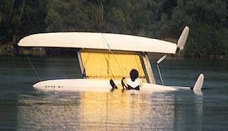 | Das Boot steht sicher und fest auf seinen Schwimmern. Nun noch ein kurzer Schwung auf das Trampolin und schnellstens ans Ufer. Denn: Wer weiß ob das schon alles war? |