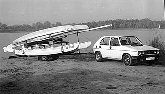 Hobie 14 Segler (Axel und Thomas) wollen den Windgott herausfordern. Sie ziehen ihre Boote ins